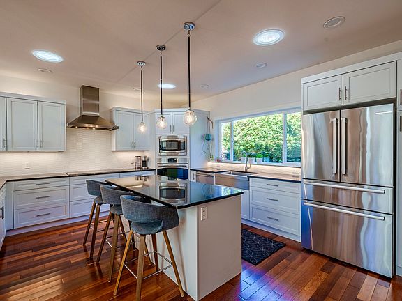 Lifestyle meets comfort, 5-bed, 4 bath, 3 dens, 3-bay garage, gated & private. Main floor: Vaulted ceilings open living/dining, kitchen, lounge room, 3 bed including grand master wing, walk in pantry, laundry/storage, live edge dining table (included) & mud room. Lower level: surround sound theatre with seating & equipment included, gym, full glass front sauna with LED lighting & shower, 2 bed, 2 den/office spaces. Low-maintenance yard, heat pump for air-con & efficient heating, 3 fireplaces, wood & gas. Central location, quality home with a great layout and spaces for all. Matured landscaping for privacy.