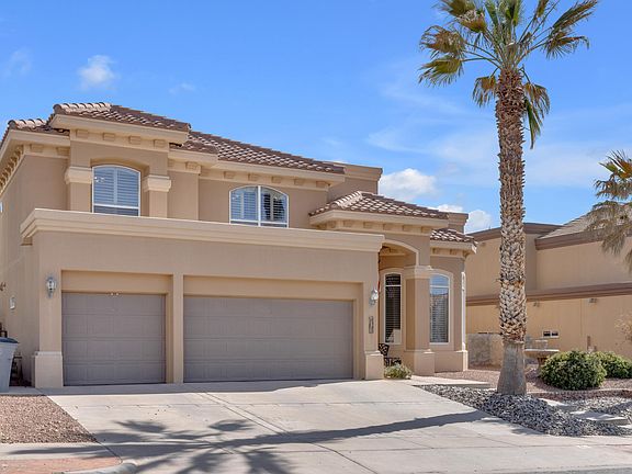 Set against the dramatic backdrop of the Franklin Mountains, this captivating 4 bedroom, 4 full bath home in the prestigious Franklin Hills Subdivision blends luxury, comfort, and unforgettable views. Spanning 3,882 sqft, this thoughtfully designed two-story home offers a seamless mix of elegance and functionality. It features two living areas—one with immersive surround sound, the other a formal space perfect for entertaining or relaxing. A versatile office or in-law suite aside from the 4 rooms includes rich built-in wood shelving. The kitchen showcases European-style cabinetry, granite countertops, crown molding, and plantation shutters throughout the house. Upstairs, hardwood floors lead to a luxurious master retreat with a private balcony facing mountain views, jetted tub, walk-in shower, and walk-in closet. Outside, enjoy a view lot, stylish gazebo, outdoor kitchen, and 3-car garage. Inspection report on hand w/ major updates such as a new water heater, elastomeric roof coating, fireplace glass, & more