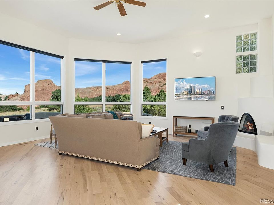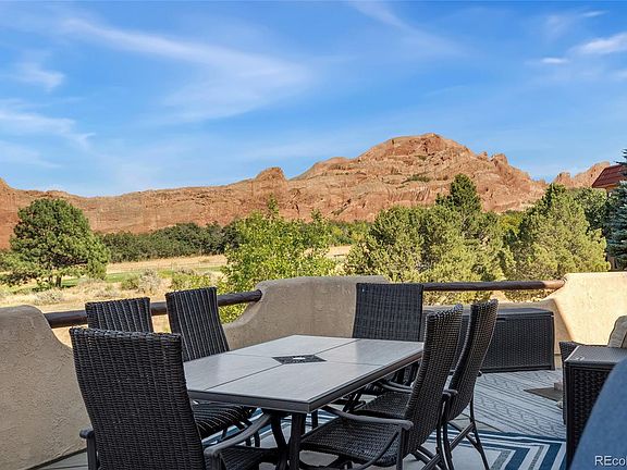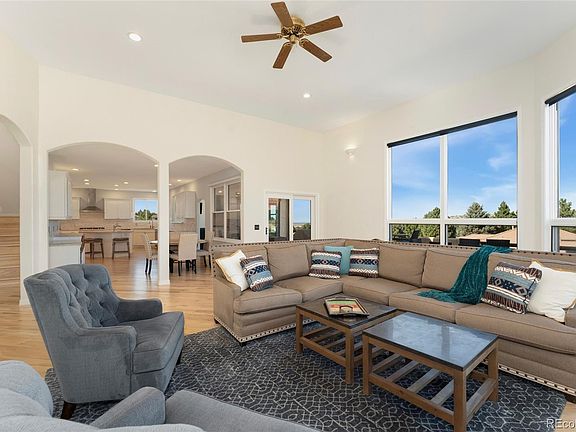 Set on one of Roxborough Park’s most extraordinary lots, this home captivates with sweeping panoramic views of dramatic red rock formations, the Arrowhead Golf Course, Chatfield Lake, city lights, and the Pike National Forest. A brick paver driveway leads to a hickory-floored interior that flows seamlessly throughout the main level, creating a warm, elegant atmosphere. The heart of the home is a chef’s kitchen with slab granite countertops, newer appliances including an oversized Thermador refrigerator, gas cooktop, and wine cooler, plus a generous prep island that opens to a sun-filled sunroom and expansive living area with vaulted ceilings and pristine views of a signature red rock formation. Perched for ultimate privacy, the primary suite occupies the entire upper level, serving as a serene retreat with dual walk-in closets, separate vanity areas, a spa-inspired five-piece bath, and a private rooftop deck beneath a custom pergola where the twinkle of downtown Denver’s skyline meets the stillness of the surrounding red rocks. The walk-out lower level is designed for recreation and productivity, featuring an expansive additional office, a large exercise room, a fireplace, wet bar, pool table, two bedrooms, and a full bath, all opening to a backyard brick paver patio. Outdoor living is exceptional with multiple spaces to gather and relax including a covered patio, paver courtyard, rooftop deck, and lush landscaped yard with sprinklers front and back, all designed to maximize the sweeping vistas and natural beauty of the setting. Additional highlights include all hickory kitchen and bath cabinets, remodeled bathrooms, new bedroom carpet, window treatments, a whole-house generator, new furnace, AC, and water heater, ensuring every detail has been thoughtfully updated. This home is a rare opportunity to experience a lifestyle defined by luxury, tranquility, and Colorado’s most iconic scenery.