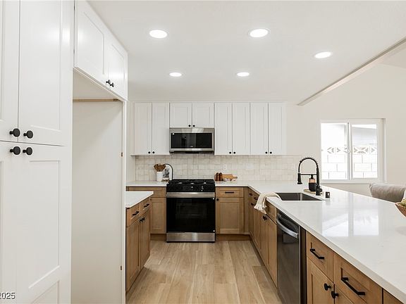 Experience casual elegance w/NO HOA & a 3 Car Garage! This flawless single story embodies subtle sophistication with bespoke details throughout. In the kitchen, lavish quartz counters sit atop two-tone cabinets accented by matte black hardware, stainless appliances and hand picked backsplash. Luxurious plank vinyl flooring throughout complements a soothing modern paint palette. In the luxurious owner's suite, premium shower fixtures surrounded by custom tile and enclosed in plate glass impress immediately, while a stylish dual vanity finishes this spectacular room. Vaulted ceilings complement bespoke beams in the formal living room, while a relaxed family room overlooks a covered terrace and generous pool area. Be sure to check out our 3D Virtual Tour, and schedule a private viewing today!