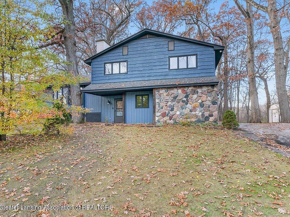 Discover space, privacy, and lake-area living in this 3-bedroom, 3-bath home on a wooded ½-acre lot, set far off the road for a hidden, up north feel. Every room is generously sized, with a smooth-flowing layout, a stonework fireplace in the living room, and a kitchen offering abundant cabinets and counter space. The dining area opens to a deck with a pergola where you can sip your morning coffee while taking in the views of Lake Lansing. The clean and dry basement- complete with a second fireplace- is ready to suit your needs! Enjoy the convenience of an attached heated 2-car garage (so cozy!) plus all the perks of the Lake Lansing community—parks, beaches, eateries, and more just minutes away.
