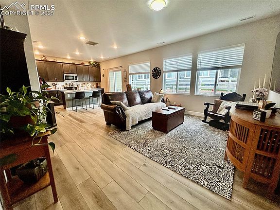 LOCATION! One block from Wolf Lake! Beautiful Wolf Ranch townhome in the desirable Sage Meadows community offers the perfect blend of modern comfort and convenience, featuring a 2-car garage and a fully fenced backyard! MOVE IN READY! This meticulously maintained 2-bedroom, 2.5-bath home is ideal for even the most discerning buyers. Take in the gorgeous views of Pikes Peak and enjoy the home's prime location near this serene natural oasis of Wolf Lake. Upon entry, you'll be welcomed by a dramatic, airy foyer with soaring ceilings and an abundance of natural light. The open floor plan is compliments by the luxury vinyl plank flooring throughout the main level which adds a contemporary touch, complementing the living room that seamlessly flows into the dining area and well-appointed kitchen. The chef’s kitchen boasts ample cabinetry, recessed lighting, low maintenance quartz countertops, a large island with seating, sleek stainless steel appliances, a generous pantry, and stylish upgraded fixtures. Step outside onto the patio to relax and enjoy the peaceful backyard. Upstairs, you'll find a conveniently located laundry room (washer and dryer included) and the luxurious primary suite. The primary suite opens into a large primary bathroom, complete with dual sinks, quartz countertops, a walk-in shower with a bench seat, a private "water closet", and a spacious walk-in closet. This version of the "Poplar" plan has 2 bedrooms with a generously sized loft which gives a ton of light into the foyer and creates an airy feeling as well as allowing for flexibility of use (office, guest space, den, exercise room). The additional lovely bedroom offers a gorgeous view of Pikes Peak and a full bath completes the upper level. For added comfort, the home includes A/C to keep you cool during Colorado's warm summers, and it's an inside unit, so heating/cooling is more efficient! A tankless hot H2O heater provides hot H2) on demand! All that's left to do is MOVE IN!
