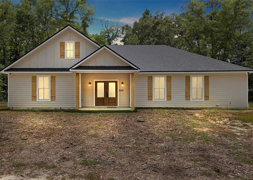 Priced to sell with motivated sellers and instant equity opportunity! This 2023 custom-built modern farmhouse offers 2,011 sq ft of luxury living on 8 peaceful, partially wooded acres in Alachua, Florida. Designed for both style and function, the home features vaulted ceilings with exposed wood beams, luxury vinyl plank flooring throughout, recessed lighting, and a spacious open-concept layout perfect for entertaining. The gourmet kitchen is a showstopper with top-of-the-line ZLine appliances with gold hardware, a 12-foot quartz island, pot filler, custom backsplash extending to the ceiling, floating shelves, and a large walk-in pantry. The primary suite offers a spa-like retreat with oversized windows, dual rainfall walk-in shower, freestanding soaking tub, and floating double vanity. Enjoy morning coffee or sunset views from the expansive covered back porch overlooking the serene landscape and abundant wildlife. Thoughtfully planned for future expansion, the home is designed for easy addition of a garage via breezeway or even a pool—ask how construction can be rolled into your loan! Outdoors, the possibilities are endless—bring your animals, equipment, or garden plans. A tractor and storage container can be negotiated with the sale, offering a turnkey setup for anyone looking to start or maintain a farm or homestead. Just minutes from Alachua and Gainesville amenities, this property combines modern elegance with rural freedom. Don’t miss your chance to own this rare and stunning retreat—schedule your showing today!
