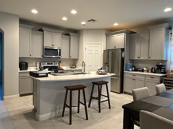 Large kitchen cabinets and stealing steel appliances, quartz countertops