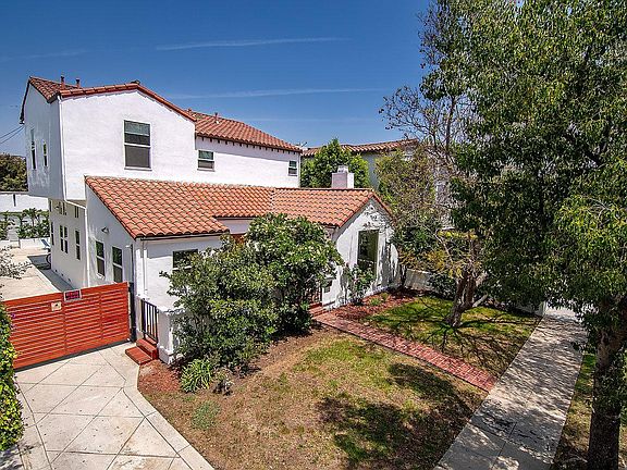 BEAUTIFULLY REDESIGNED SPANISH WITH BONUS DETACHED GARAGE/FLEXIBLE SPACE IN BEVERLY GROVE. This stunning two-story home, remodeled from top to bottom has it all. The first level offers a bedroom/office and full bath, a large formal dining room with fireplace, living room and spectacular island kitchen with top-of-the-line stainless steel appliances, wine fridge, multiple freezer drawers, laundry room, eating/sitting area leading to a covered rear patio and yard. The upper level boasts a luxurious master suite with spa bath featuring an oversized shower, soaking tub, dual sinks and walk-in closets, two generous guest bedrooms and guest bath. The garage has been finished as a work space/flexible space with a sleek roll-up door, two ductless HVAC units and tons of windows/natural light. Additional features include central and ductless HVAC, security system with cameras, high ceilings, wide plank wood floors, recessed lighting, new windows, gated driveway, in an ideal mid-block location.