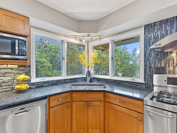 The kitchen, remodeled in 2018, showcases warm wood cabinetry, stainless steel appliances, granite countertops, and sweeping river views through large windows—perfect for enjoying the scenery while you cook or entertain. The sun-filled living room boasts vaulted ceilings with exposed beams, original hardwood floors, and a cozy fireplace framed by an expansive wall of windows overlooking the backyard and river. The recently remodeled lower level walks out to the lush yard and overlooks river views from the family room. Extensive updates include a full basement remodel in 2025, new carpet (2025), new boiler with zoned controls, AC on the main level (2025), new siding (2023), and a new roof (2020). The property has added features like a river-fed irrigation system, city sewer and water, outdoor motion lighting, and a 20×40 garden plot ready for your green thumb.