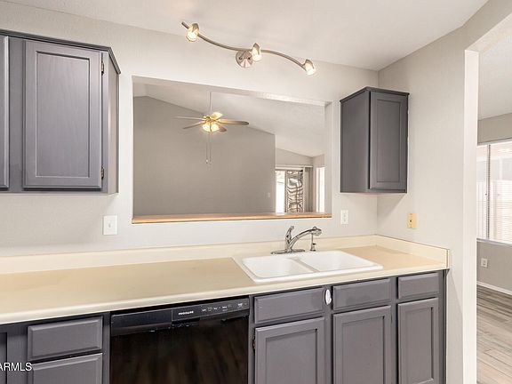 Delightful single-story home at Country Hollow in Glendale! This 3 bedroom, 2 bathroom home with 2-car garage features fresh paint throughout and brand new plush carpet in the bedrooms. Inside you'll find wood-look tile plank flooring, vaulted ceilings, abundant natural light, and neutral tones in a practical layout. The kitchen offers ample cabinetry, counter space, built-in appliances, and a pass-through with breakfast bar. The spacious primary suite includes a full ensuite with dual sinks, separate shower & tub, walk-in closet, and private exit to the patio. The backyard boasts a cozy covered patio perfect for morning coffee or peaceful evenings, plus a storage shed and putting green. Welcome home!