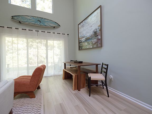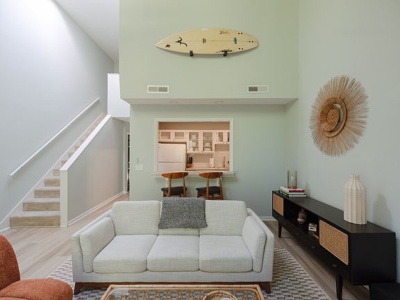 If rented furnished: Each bedroom is thoughtfully decorated to create a serene atmosphere. The first bedroom is furnished with a Queen bed and located on the main floor, far enough from the living space for privacy but close to the downstairs full bathroom with dual vanity and walk in shower. Upstairs, guests can enjoy a nook space with a desk and chair looking out to the windows and back yard space. The second bedroom features a queen bed and Roku Smart TV. The third bed is furnished with a full bed with twin trundle and features sky lights and spacious closet. There is a large bathroom with ample vanity space and a bath tub/shower combo.