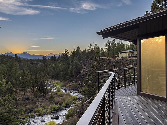 Perched high above the Deschutes River with over 140' of accessible river frontage, this magnificent property is perfectly positioned to maximize its breathtaking views of the river canyon, Broken Top, and the Three Sisters. Soak in this extraordinary setting from the back deck dining area or hot tub, or from the stunning living room, where wraparound windows frame the river view. High-end touches include acacia wood flooring, a floor-to-ceiling lava rock fireplace, granite countertops and a 5-burner Thermador range in the remodeled gourmet kitchen, and a built-in wine refrigerator in the dining area. One of two full suites in the home, the owner's suite features floor-to-ceiling windows with river and mountain views and a luxurious bath with dual walk-in closets, dual shower heads, and heated travertine floors. Enjoy a 5-car garage with extensive storage and a 50' RV parking area. An additional living suite over the garage offers a separate entry and privacy for guests.