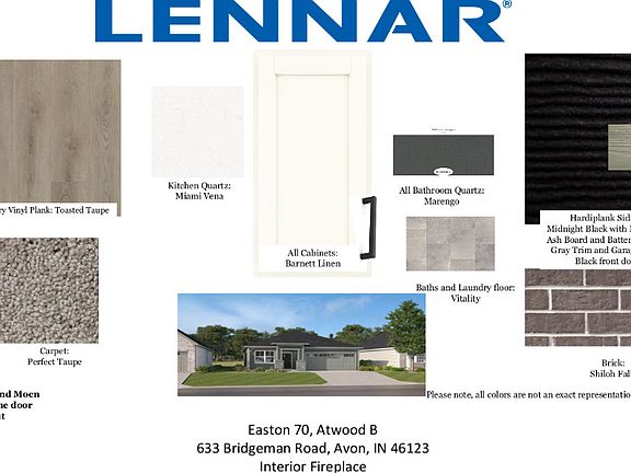 Your vacation lifestyle awaits at Lennar at Easton in Avon, part of the Easton Grey Riverwalk development! Offering the popular Atwood plan, one story, 2 BR, 2 BA, 2 Car Garage. Enjoy morning coffee on the front porch! Relax in the spacious Great Room with Gas Fireplace, designed for relaxing and enjoying every moment, Open to dining and exceptional Kitchen featuring Lennar's Everything's Included with designer curated upgrades, oversized kitchen island seats 4, included LG Stainless Steel appliances including Gas range, Microwave vented to exterior, Dishwasher. Primary bedroom with ensuite full bath featuring Oversized Shower and double bowl vanity. Hobby room or library in the additional bedroom, plus plenty of privacy for overnight guests! Host game night on the rear patio with pond view, and join a Pickle Ball game with all the free time you'll gain while the HOA maintains all lawn care. Future resort style amenities with Nottingham Club House, lap pool and splash pool, Pickle ball courts, tennis court, fitness room and more. Purchase now for Aug/Sept move in! *Photos/Tour of model may show features not selected in home.