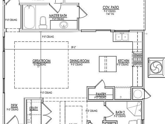 Modern roof pitchesLarge windowsCovered back patioSleek quartz countertopsAmple storage