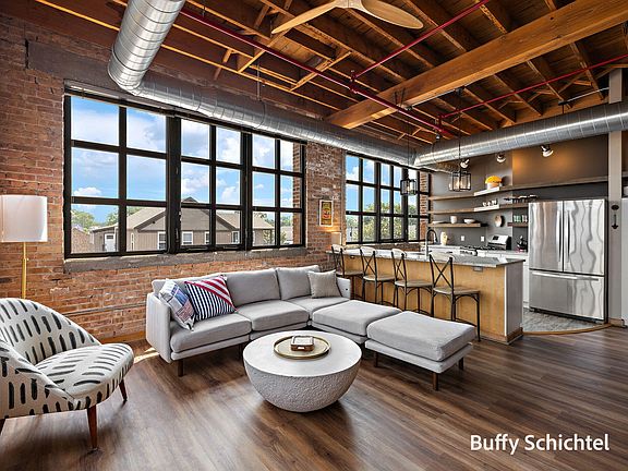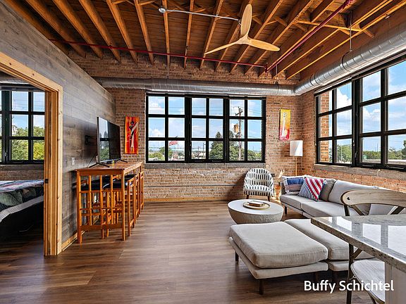 Soaring ceilingsGranite countersRenovated kitchenAmple closet spaceLarge windowsExposed brickShared patio and grill