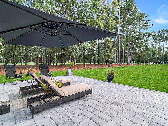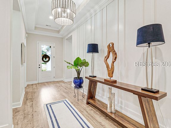 Located in the gated Riverton Pointe community just outside Bluffton, this Toll Brothers Shoal model commands views across a Jack Nicklaus Nicklaus-designed course. The nearly new residence is finished to a high standard with coffered ceilings, crown moulding, and a chef's kitchen featuring a gas range, quartz surfaces, and a large centre island. An open plan living room with a fireplace opens to an 800 square foot screened lanai and a 1825 square foot patio, offering ideal spaces for indoor outdoor entertaining. Three bedrooms, three and a half baths, and a three-car garage provide ample living space, and owners have access to resort-style amenities: a clubhouse, pools, fitness facilities, tennis, and pickleball courts. Combining modern comforts with Lowcountry character, this move-in-ready home offers an effortless transition into golf course living.
