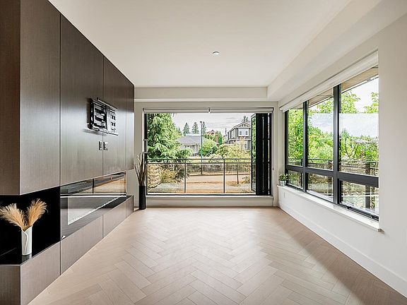 Available immediately - this elegant, like NEW 969sf, 2 bdr+flex, corner suite. A fashionable design gem both suite & building! Open concept, it features: a beautiful kitchen w/Caesarstone counters, sleek cabinetry & hi-end appliances; white oak H/W flooring throughout, stylish 72” fireplace, A/C, & is bright from large folding window walls that open for easy access to the wrap-around balcony to enjoy year round. Well-separated bedrooms; Primary with spa-inspired ensuite & in-floor heat. Amenities include: communal BBQ area, Gym, Kids Play Area, & Rooftop garden plots. Secured parking w/EV charging. Pets welcome! Ideal location - close to schools, Canada Line, Cambie Village for cafes, shops & services, Douglas Park, community centre, youth centre, daycare & more! OPEN 2:30-4pm Oct 26th.
