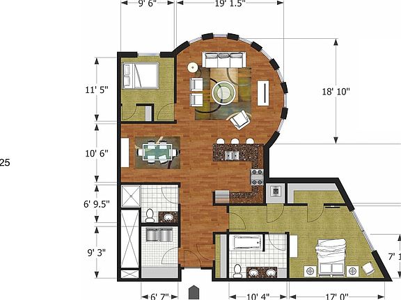 This spacious 2 bedroom + 1.75 bath is located in the Turret of the building. The "Orono"