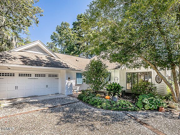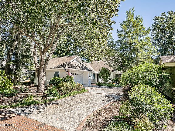 Great home in the heart of Dataw Island at a great price! Walking into this cottage style one level home you are will be drawn to the vaulted ceilings in the main living area with abundant light from newer skylights! The kitchen boasts new Bosch appliances and gorgeous high end Vetrostone countertops made with glass and seashells. There are two dining areas, one formal and one eat in kitchen style. The primary bedroom is large with incredible golf views! There are two other bedrooms with a cute courtyard between them. Off the main dining room is a huge sunroom with floor to ceiling Anderson windows flooding the home with natural light. In addition there is a large screened in porch with high ceilings and a huge deck just beyond overlooking a park like professionally landscaped yard. The home has a mix of hardwood floors, travertine in the entryway and new luxury vinyl flooring in the screened in porch. The driveway is the upgraded tabby and brick mix. Newer Bermuda shutters have been added to give the home incredible charm! The two car garage is oversized with plenty of storage above. The home has a beautiful view of the 15th hole of our premier Cotton Dike course. At a little over 2000 square feet, this is a great home at a great price!
