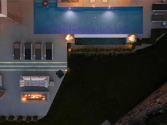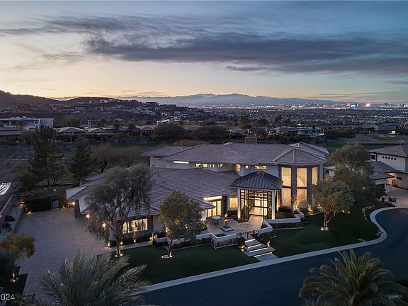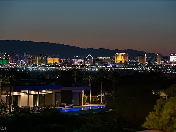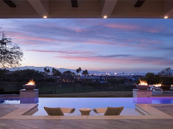 Views, views, views! This incredible home boasts Strip, mountains & golf course views from nearly every window. Sitting on a huge, 27,500 sf lot w/ lush greenery, this recently refurbished property has sleek, modern finishes & features a spectacular floating staircase. Perfect for a large family: 5 bedrooms plus office, including dual master suites—one up, one down. The upstairs primary suite is truly special w/ unobstructed city views, spa-like bathroom with large soaking tub & fireplace, two exceptional closets--one of which looks more like a designer boutique--and enormous wraparound balcony. Kitchen is loaded with high-end appliances & rich cabinetry. The great room has powered pocketing doors for an easy transition to the resort-like backyard and features a unique swim-up indoor/outdoor bar. Entertainers will also love the plush movie theater, showcase wine cellar & billiards area; spa enthusiasts will appreciate the wellness room which features both a sauna & steam shower.