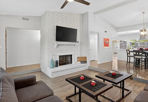 Light brick fireplaceSparkling in-ground poolUpdated bathPlush carpetBackyard oasisLaminate flooringLarge covered patio