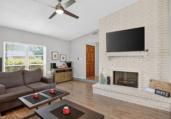 Step inside to a bright open-concept layout with a large living room, light brick fireplace, and large windows that flood the space with natural light. The kitchen shines with granite countertops, stainless steel appliances, and a sleek cook top and electric oven—ideal for everyday cooking or entertaining.