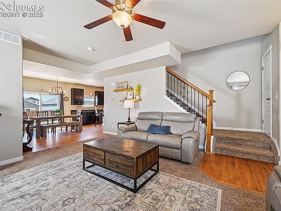 Assumable Loan! Gorgeous, BEAUTIFULLY LANDSCAPED home that wows the moment you step on the covered front porch. Through the front door the main level opens to a spacious semi private living area with stairwell access to the upper level. Through the living room the dining area flows seamlessly into the kitchen that boasts a barstool height center island, stainless steel appliances, and beautiful counters and cabinetry. Leading to the garage access door, a butler cabinet provides an ideal space for a coffee bar with added storage and counter space. Just beyond the kitchen a private room is currently being utilized as a playroom but could be utilized as a more private home office, workout area, or any other configuration needed. The dining area walks out into the beautifully landscaped backyard with concrete patio, grass area, and partial xeriscaping for minimal maintenance. Just off the dining room a recessed area has a built in desk creating a wonderful at home work space or gaming area. The upper level has three bedrooms including the master bedroom featuring a large ensuite bath with garden tub, free-standing shower, double vanity, and spacious walk in closet. Bedrooms two and three have their own walk in closets and share a full bath with double vanity. Completing the upper level is the laundry room and two alcoves to either side of the stairwell that make a great reading space. The basement access door is just off the kitchen and walks down to a room currently being utilized as a workout area, but could be used as a game room or numerous other options. Down the hall is bedroom four, a 3/4 bath, and a spacious family room. This home has endless possibilities and with the combination of semi-private and open floor plan spaces there is something for everyone. Ideally located off the Powers corridor where access to shops, entertainment, and restaurants are endless.