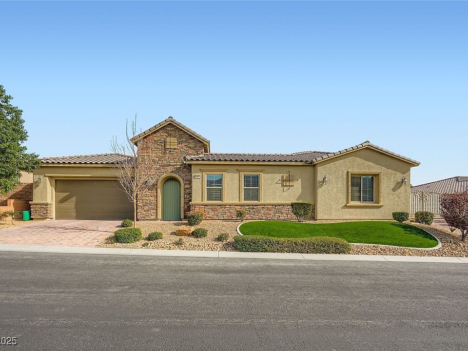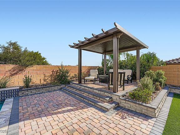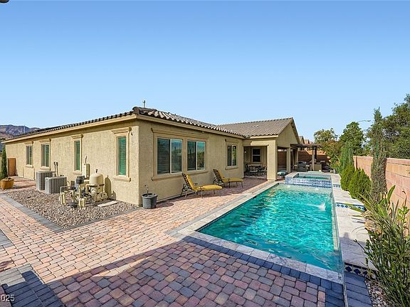 Incredible single-story home with gated courtyard entry on a spacious 1/3-acre lot with RV parking! Pride of ownership shines - this immaculate home has had one original owner. Flexible floorplan with tile in high-traffic areas, window coverings, and ceiling fans throughout. Sunny kitchen features sleek cabinetry, modern pulls, double island, breakfast bar, cooktop, double ovens, microwave, 72" fridge, and water filtration system. Open-concept layout flows into the large dining area and inviting living room. Primary bedroom offers 2 walk-in closets, dual sinks, spa-like shower, and soaking tub. Three additional bedrooms have walk-in closets and bathroom access; fourth bedroom has exterior access to the courtyard—perfect for casita use. Flex space/Den separates the primary from guest rooms. The backyard is an absolute dream dream: shady patio, full outdoor kitchen, sparkling pool, relaxing spa, pergola with firepit, and Strip views! Three-car tandem garage with epoxy floors. HURRY!