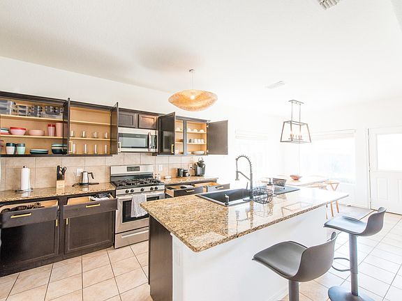 Gas stoveOpen floor planNew interior paintStainless steel fridgeDining roomGranite countertopsCovered patio