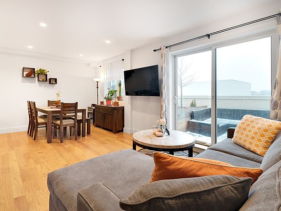 Outdoor lovers' delight! This is the nicest two bedroom condominium that you will find in Ridgewood! This 835 Sq. Ft. two bedroom, top floor, sun-filled apartment, consists of an open floor plan concept which leads out to a gigantic private terrace, measuring approx. 468 SF directly from the living area. The apartment features a large eat-in gourmet style kitchen which comes replete with stainless steel appliances, including a dishwasher and custom light grey kitchen cabinets which are offset by the dark grey subway tile backsplash and quartz countertops. The kitchen overlooks the dining area which flows into the living area. Both of the bedrooms feature an abundant amount of closet space, and the master bedroom includes two large walk-in closets. The bathroom features a large deep soaking tub. The apartment also features blonde walnut hardwood flooring, split zone heating and cooling units in the living area and bedrooms, as well as large oversized windows and a washer/dryer combo unit. Located in Ridgewood's premier building at 63-34 Fresh Pond Road, you will find luxuries that very few apartments in the neighborhood have to offer. The building offers a fitness room, a pet spa, bike storage, a common roof deck, an elevator and private storage in the basement. The building is located mere steps from the major hub of activity in the up and coming neighborhood of Ridgewood, approximately seven blocks from the Fresh Pond Road M train station. This provides ease of access to the L train, located just two stops away at the Myrtle-Wyckoff Avenues train station. Built in 2015, the building features a 421A tax abatement with another 11 years left until 2030. Simply said, this apartment demands to be seen! *Please be advised, these pictures are of the actual apartment, having been taken prior to the current tenants moving in.