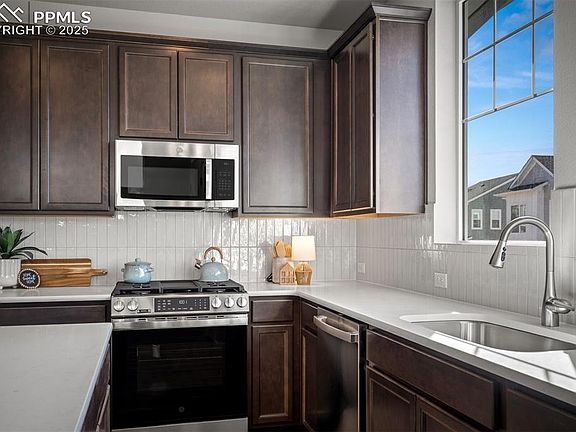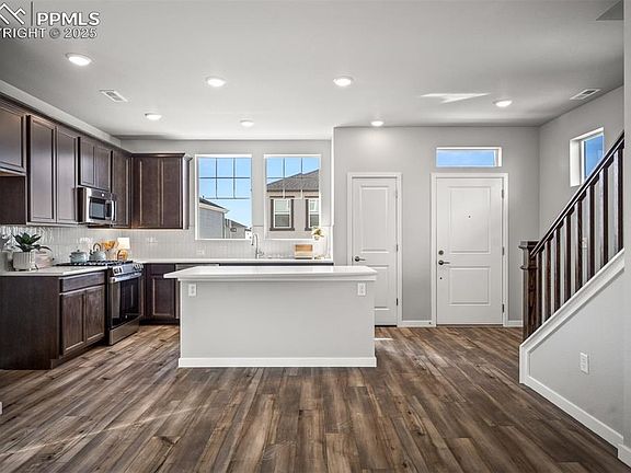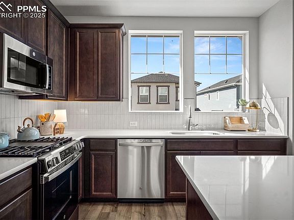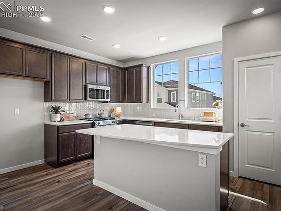 Nestled in the highly sought-after District 20 school district, this stunning new home in Wolf Ranch offers the ideal blend of luxury, comfort and convenience. Boasting three spacious bedrooms, two and a half elegantly appointed baths, and an array of high-end finishes, this new home for sale in Colorado Springs, CO, is designed to elevate everyday living.    Upon entering, you are welcomed by a warm, inviting atmosphere that flows effortlessly throughout this new  home. Rich luxury vinyl plank flooring spans the main level, while large windows and a sliding glass door bathe the living area in natural light, creating a bright and airy space that’s ideal for both relaxing and entertaining.    At the heart of the home is a chef-inspired kitchen, featuring 42-inch upper cabinetry, pristine quartz countertops and a large island perfect for meal prep or casual gatherings. Top-tier GE stainless steel appliances combine form and function, while the adjoining dining area sets the stage for intimate meals.    The open-concept layout seamlessly connects the kitchen and dining area to the cozy living room, featuring a fireplace and a comfortable space for quiet evenings or lively social gatherings. Outside, a xeriscaped side yard provides a private low-maintenance retreat, perfect for enjoying Colorado’s beautiful outdoors.    When it's time to unwind, the luxurious Owner's Retreat awaits, offering a spa-like Super Shower and premium finishes that transform everyday routines into a truly rejuvenating experience. Thoughtful design details and upgraded features throughout the Owner's Retreat create a serene sanctuary, providing the ideal escape at the end of the day.    Located in the highly desirable master-planned community of Wolf Ranch, this brand-new home offers the perfect mix of modern living and tranquil surroundings.