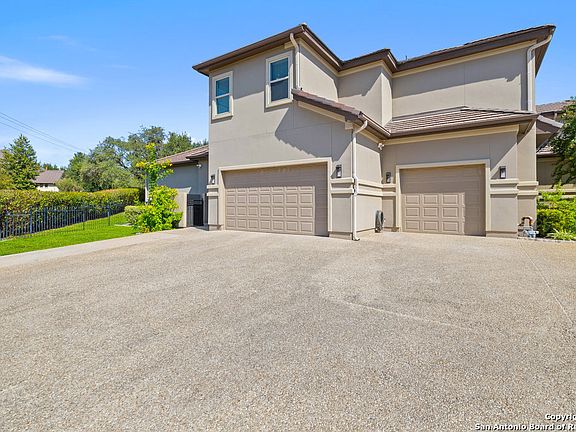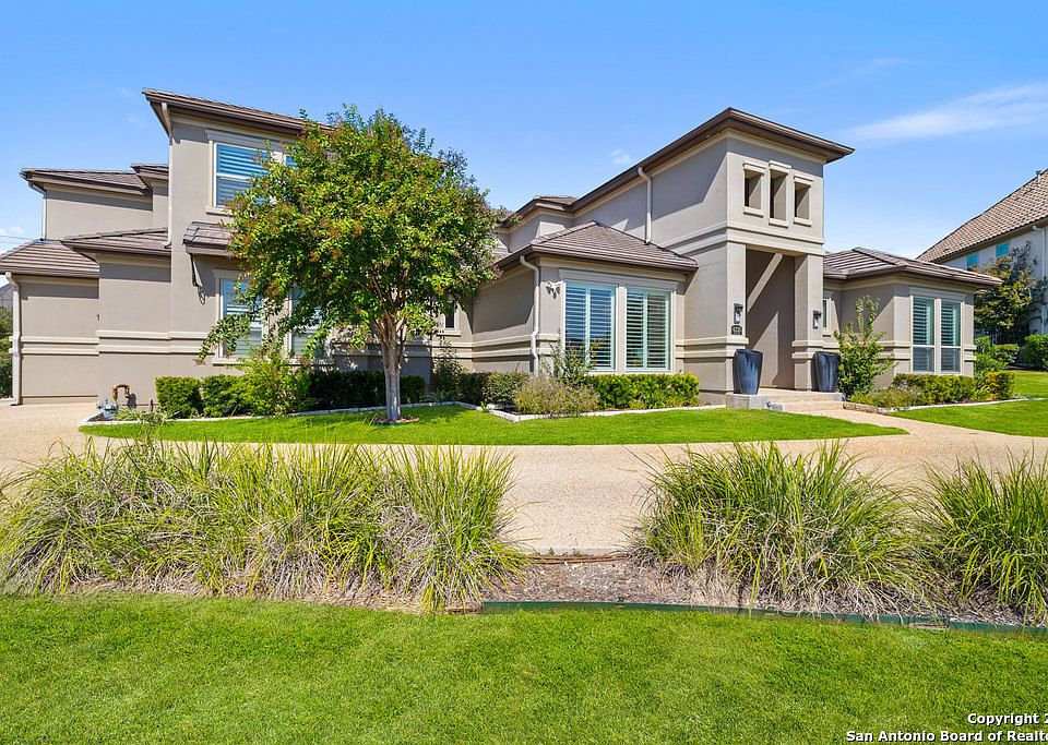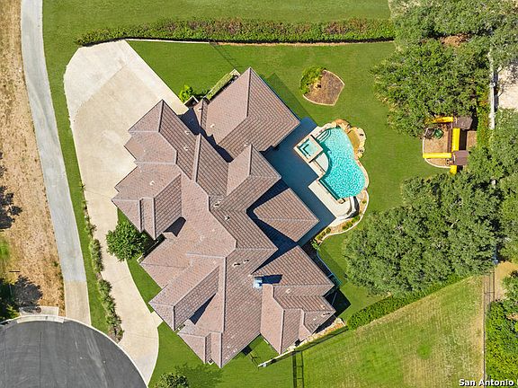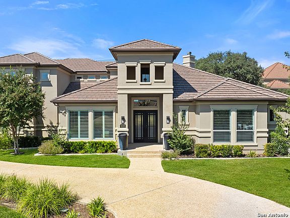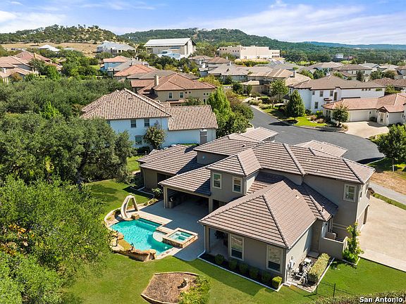 Experience elevated living in The Dominion. Tucked at the end of a quiet cul-de-sac, this stunning Mediterranean contemporary masterpiece sits on a half-acre lot and was built by highly respected local builder McNair Custom Homes, known for exceptional craftsmanship and timeless design. Spanning 4,905 square feet, the home offers 6 bedrooms, 5 full baths, and 2 half baths, and lives like a single story with three bedrooms and a spacious game room downstairs, and only three bedrooms and a loft upstairs. Designed for comfort and style, five of the six bedrooms are private en suites, and the interior showcases rich wood and tile flooring, high ceilings, and an open, light-filled layout ideal for entertaining. Outside, enjoy resort-style living with a Keith Zars Pool and adjoining spa, an outdoor kitchen, and a covered living area perfect for gatherings. Set within the prestigious, guard-gated community of The Dominion, this home exemplifies sophisticated Hill Country living-offering elegance, functionality, and a peaceful setting in one of San Antonio's most sought-after neighborhoods.