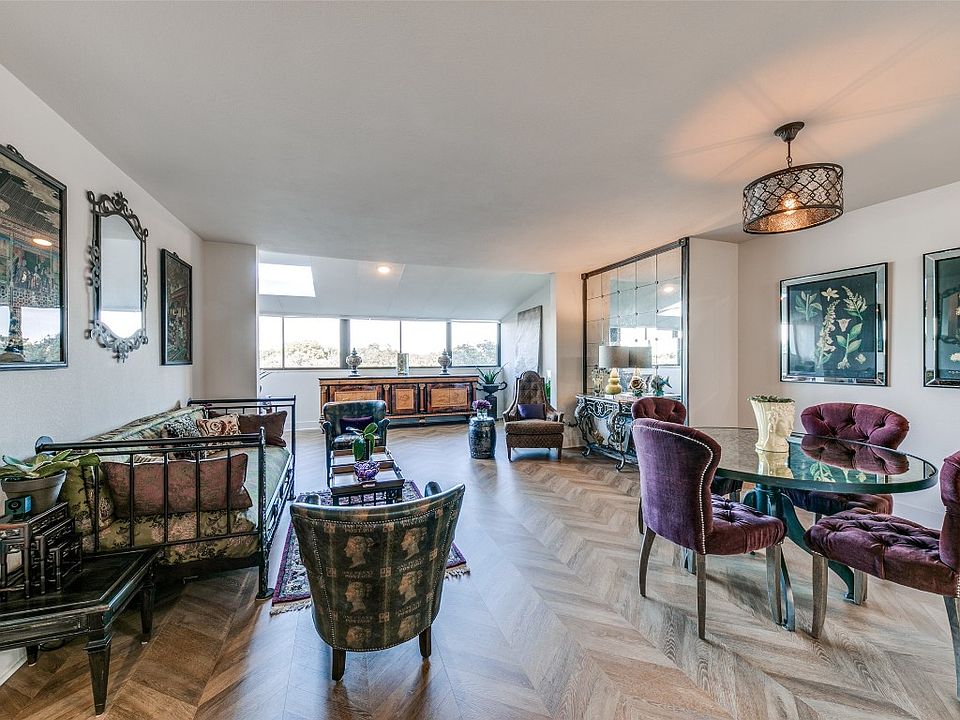 All utilities paid via HOA dues - Includes electricity, internet, cable, water, & trash. One bed, one bath condo in Preston Hollow, walking distance to Preston Center restaurants and shops - 4th floor treetop views from wall of windows, very private (no units above or below) with exceptional finishes and custom closets. Individual HOA-maintained HVAC, deeded storage room. Amenities include heated indoor saltwater pool, gym, library, billiards room, and indoor and outdoor common areas. One secured enclosed garage parking space assigned per licensed driver.