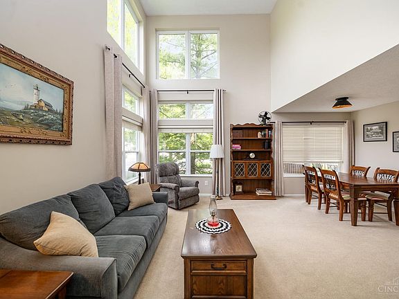 Charming end-unit townhouse condo unit conveniently located in Eagle View Village. This home has 2 bedrooms and 3.5 baths featuring an updated style and move-in ready condition. Floor to ceiling windows bring in natural light throughout the open floorplan. Finished basement with full bath. Prime location with community pool and Mason Golf Center.