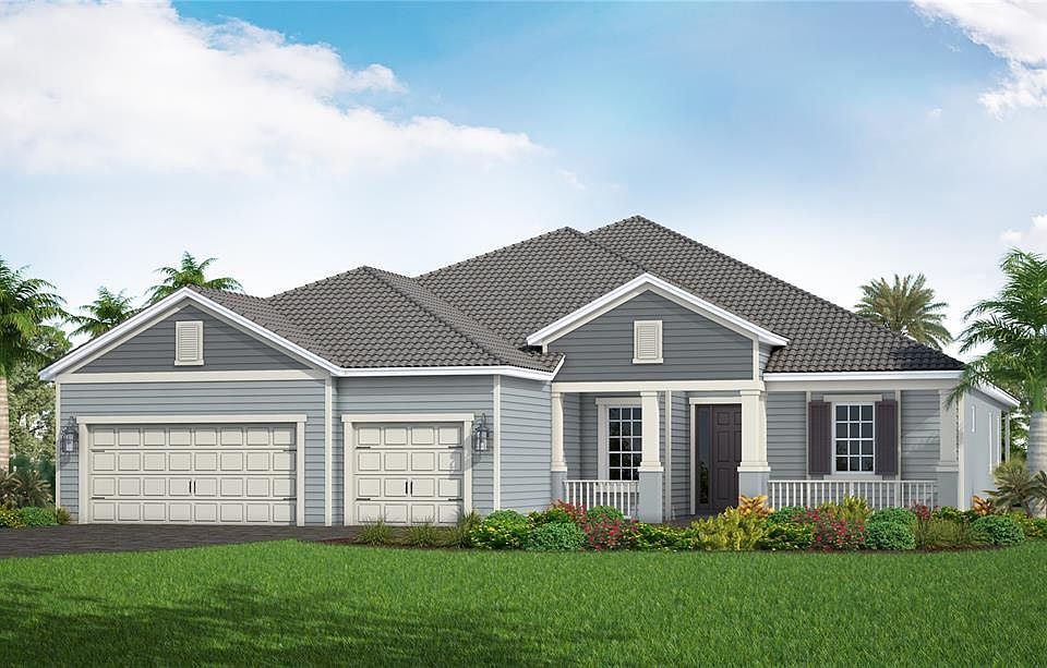 Under Construction. This stunning Island-elevation home offers a perfect blend of luxury, comfort, and Florida living. Step onto the welcoming front porch and into a spacious foyer that opens to an extra-long living room seamlessly connected to the dining area. Pocketed sliding doors lead to the lanai, where serene pond and preserve views create the ultimate backdrop for relaxing or entertaining. Enjoy the sparkling pool and spa surrounded by pavered decking for effortless indoor-outdoor living. Inside, a club room with its own lanai access provides a versatile retreat, while the front den with French doors is ideal for a home office. The mudroom and utility space off the garage add everyday convenience. Guests will appreciate a private suite, and the primary bedroom features an impressive spa-style bath with a soaking tub. Designed for gathering, the gourmet kitchen and outdoor living spaces are truly the heart of this home. This home truly must be seen to be believed.