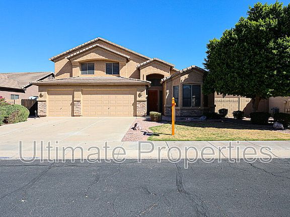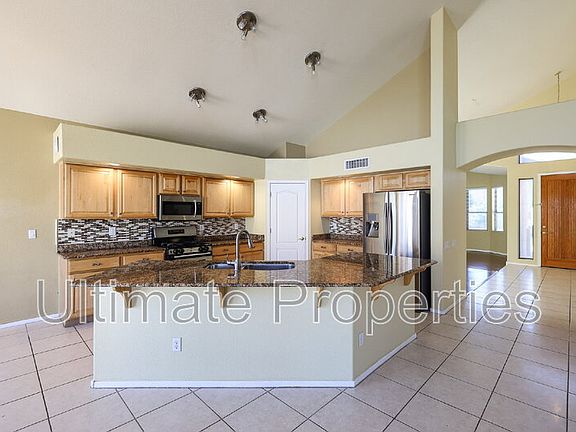 4 bedroom plus 2.5 bath home with a 3-car garage! Spacious kitchen has stainless steel appliances including refrigerator, range, built-in microwave, and dishwasher. Kitchen island and spacious living/dining areas. Master suite features dual sinks, separate tub and shower, and dual closets. The home backs up to the desert mountain preserve offering gorgeous mountain views! Covered patio, beautiful combination of grass and desert landscaping, and a swimming pool. Tour now!!