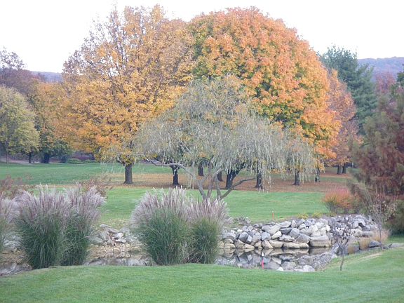 Live maintenance free in this gorgeous home with the best views at Penn National, overlooking the ninth fairway of the Founders Course. The condo windows offer spectacular views of the golf course, mountains, and lake. Three minute walk to the restaurant, pro shop, pool, and pickle ball/tennis courts. Totally refurbished with over $100K spent. Private elevator to second floor from a spacious upgraded two-car garage with extra custom storage. Security system. Nine-foot high ceilings, crown molding and hardwood floors throughout, new high efficiency furnace and A/C, hot water heater. Completely repainted. New kitchen and stainless steel appliances. New high-end laundry. All new lighting. Custom walk-in closet. Office has custom desk and bookcases. More storage space than any other local condo. Custom entryway doors. NOTE: Half of the condos on Ninth View are two-bedroom, one-car garages and half are three-bedrooms with two-car garages.