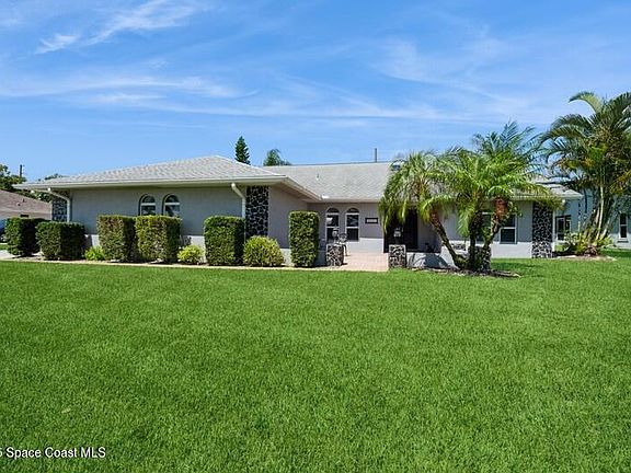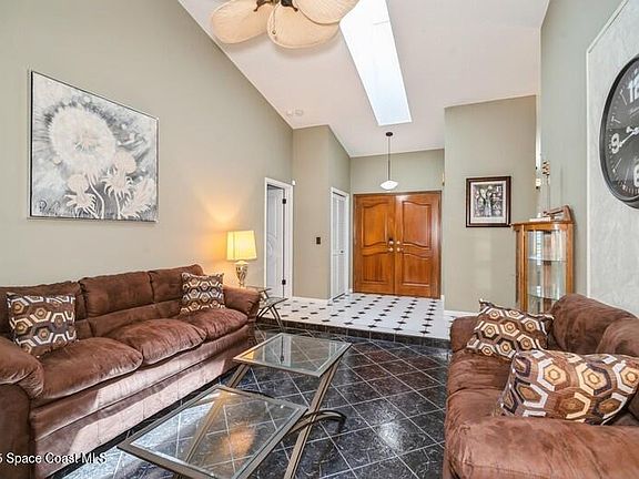 NEW PRICE! Welcome to this waterfront community with custom homes throughout. This home features soaring ceilings, skylights, fireplace, screened pool, lush palm landscaping, side entry garage, additional parking, and on oversized lot of 0.52 acre. The entry drops down a step to the formal living room and the current office space could be a 4th bedroom or was previously a formal dining room. The split plan has primary bedroom and en-suite bathroom on one side and the 2 other bedrooms and bathroom on the other side. The center of the home is the oversized family room, kitchen with island, and dining area. The kitchen has custom wood cabinets, sleek black granite counters, built in microwave and oven, dishwasher, side by side French Door refrigerator, and pull out drawers. The oversized 2 car garage is huge and there is an inside laundry space with utility sink. The screened porch was enclosed to a Florida room under air by prior owner. Tropical pool setting with palms for seclusion.