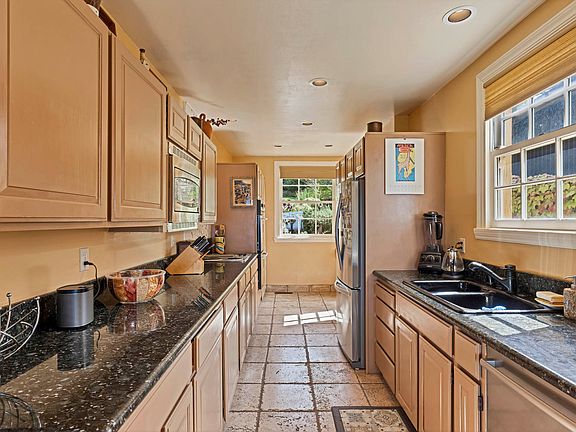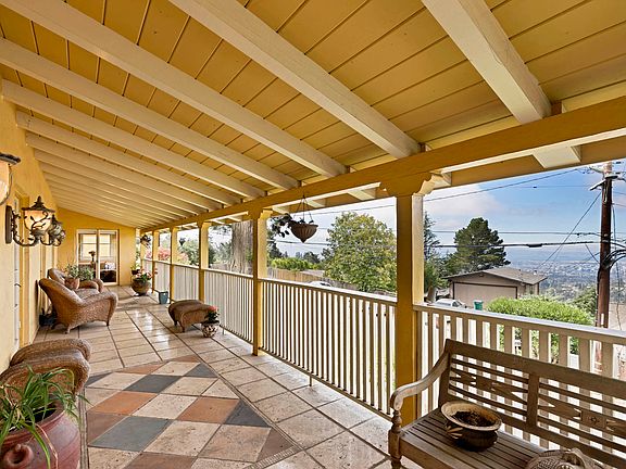 This gracious, light-filled Mediterranean greets you with a broad verandah and sweeping Bay views. A wide staircase from the lower floor and its private primary suite (the spa-like bathroom is sure to please!) leads to a vaulted living room and adjacent formal dining room, both featuring original details. The updated kitchen includes a breakfast nook (coffee with views!) and access to the expansive backyard and sunny southern exposure - perfect for entertaining or hammocks. French doors from each of the two charming upper bedrooms welcome summer breezes off the common patio. A large two car garage sports a Tesla charger.