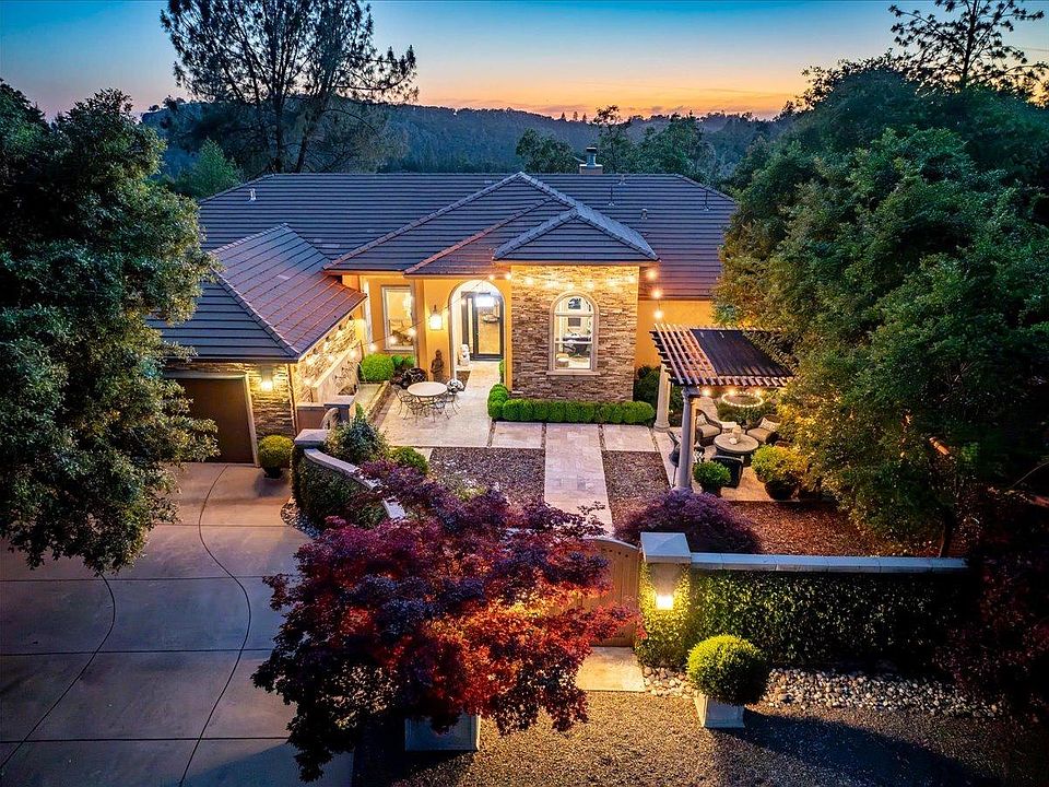 Tucked behind a gated courtyard and embraced by nearly 8 acres of rolling hills, this extraordinary Mediterranean estate is more than a home, it's a lifestyle. A stone water feature invites the day's calm upon entering your retreat. Every inch of this 3,223 sqft masterpiece is intentional, from the soft curves of rotunda ceilings to the warmth of radiant heated floors that span the home in mocha tones- each zone thermostated for perfect comfort. Four spacious bedrooms plus office offer both retreat and versatility. Venetian plaster walls glow in the daylight, while cast stone accents, including a grand fireplace framed by lit niches, speak to the artistry throughout. The formal dining room, crowned by a backlit dome ceiling and striking chandelier, sets the tone for celebration. The kitchen stuns with a dramatic granite island and Thermador appliances built for culinary expression. The rear veranda with vanishing-edge water feature and built-in grilling station leads to one of two primary retreats, where a jetted Kohler tub and dream-worthy closet feel like a private spa. The lower acreage features a 1,200 sqft workshop ideal for projects or an extensive auto collection. This unique estate is truly one that balances elegance with earthy comfort and connection with privacy.
