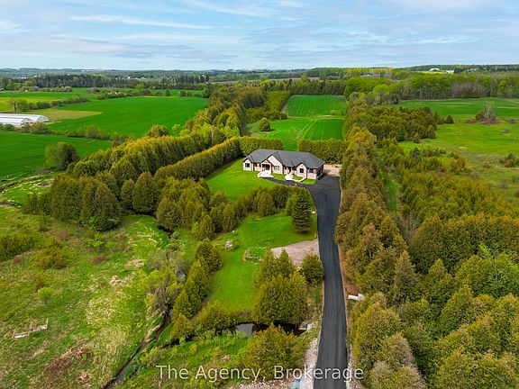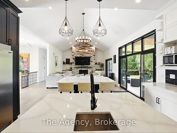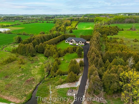 A rare opportunity to own this stunning, custom-built home, offered for the first time! Boasting over 5,000 sq. ft. of living space, this exceptional property is conveniently located on Hwy 10 with natural gas service. The exterior showcases timeless stone and brickwork, complemented by striking Douglas fir beams inside. Step into an inviting interior with soaring 10-foot ceilings throughout, elegant 8-foot doors, and a seamless open-concept layout. The full chef's kitchen, complete with a double island, flows effortlessly into the expansive deck, perfect for indoor-outdoor living. The primary suite offers a spa-like ensuite and two walk-in closets. This home features 3+2 bedrooms and 3.5 baths, with a lower level boasting 9-foot ceilings, an in-law suite with a separate entrance, a gym, and in-floor heating throughout. The heated and insulated garage is designed for versatility, featuring high ceilings ideal for a lift, a Tesla charger, and a backup generator. The property is enhanced by 20 years of meticulous landscaping, a mature cedar tree line, power-gated entry, additional parking pads, an invisible fence with a dedicated dog run, and a breathtaking spring-fed river teeming with speckled trout. An extraordinary home combining luxury, comfort, and nature, don't miss this one-of-a-kind opportunity! The driveway has been recently paved.