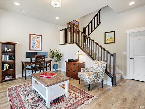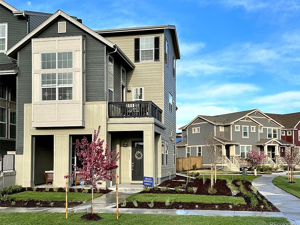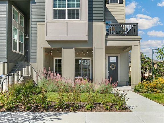 This is the Central Park townhome you’ve been looking for! A highly desirable David Weekley end-unit townhome offering contemporary elegance, high-end finishes, open and airy layout, and sought-after location steps from Rocky Mountain Arsenal Wildlife Refuge. Enter to the sunlit main floor foyer flex space. The huge sliding glass doors open to the shady covered patio for a dedicated outdoor sanctuary. You'll find convenient under-stair storage (with shelving), and a built-in mudroom accessing the attached 2-car garage. Upstairs is the sun-filled main living area with soaring 12.5-foot ceilings, three-sided ‘peninsula’ glass fireplace with stacked-stone surround and custom finishes throughout. The dining area and ½ bath are adorned with white board and batten wall treatments. The chef’s kitchen offers generous cabinetry, black quartz counters, oversized island, matching GE stainless appliances (with upgraded extra quiet dishwasher), pantry, and 5-burner gas cooktop with stainless hood. Step out on the balcony for mountain views and outdoor grilling. Continue down the hall to the designer primary suite with laminate flooring, spacious walk-in closet, and tastefully upgraded primary bathroom featuring black quartz dual vanities and over-sized shower. Upstairs to the third level finds the laundry, an additional landing space perfect for a quiet reading cubby or workspace, two guest bedrooms each featuring walk-in closets, and private ensuite full baths with white quartz counters and custom tile flooring. Complete with on-demand water heater, washer and dryer (included), and a garage wired for EV charging. This perfectly appointed townhome is nearly new and move-in ready. Located within Central Park’s Northfield community offering top amenities like scenic trails, playgrounds, community pool, pickle ball courts, top-rated schools, and a myriad of dining and shopping choices. This selection of townhomes rarely hit the market, don’t miss your chance to own this one!