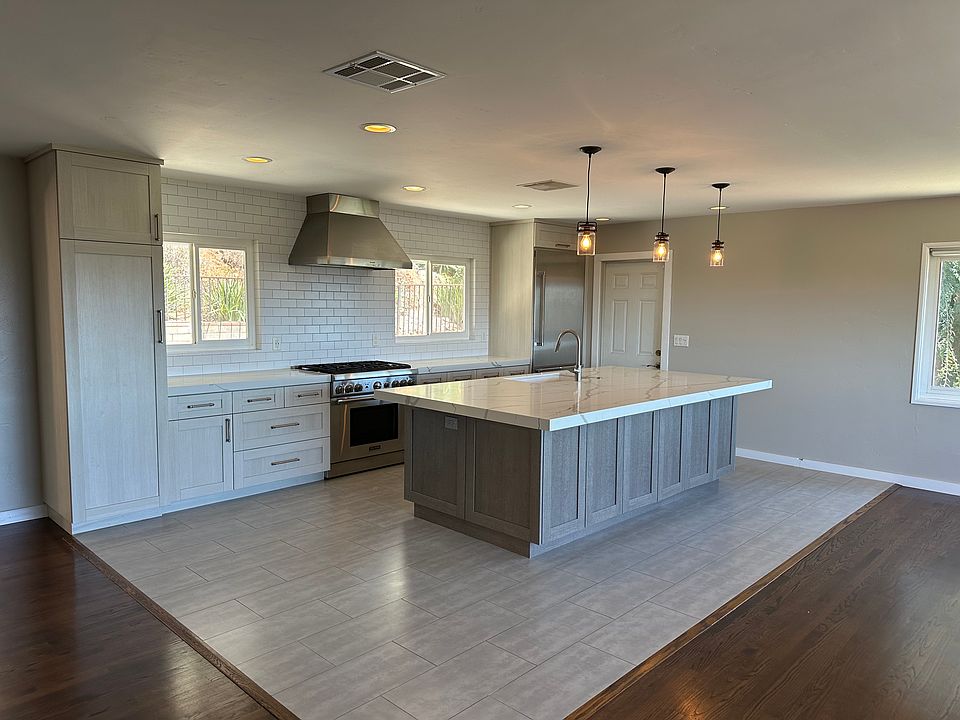 Chef's Kitchen: Large kitchen with high-end professional appliances, plenty of storage, and a completely open floor plan that flows into the living and dining areas.