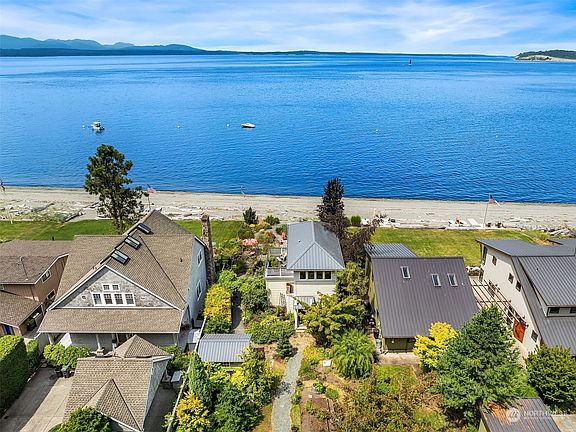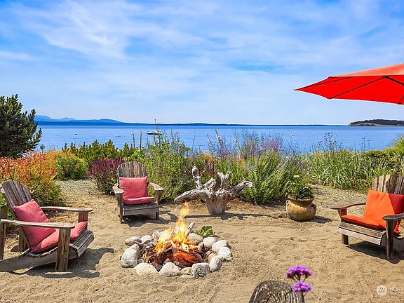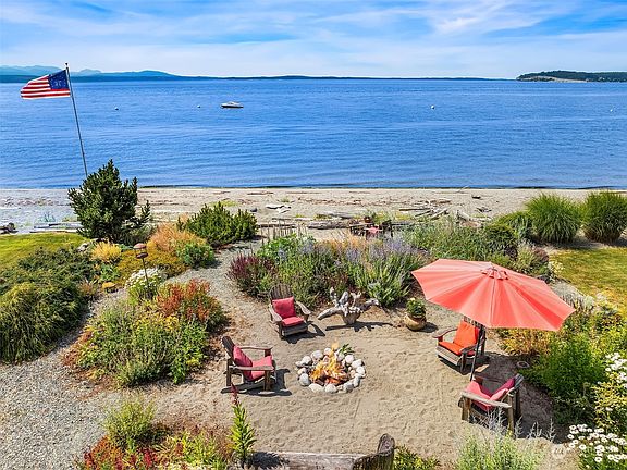 Soothe your soul on the iconic sandy shores of majestic Mutiny Bay in this timeless Ross Chapin beachfront retreat! Set on a premier .23 acre oasis with 180° views, 50' of prime west-facing no-bank Puget Sound frontage & plenty of space for building expansion opportunities. A brilliantly designed work of art features open living concept with exquisite custom details, high-end materials, tall ceilings & walls of windows showcasing dazzling views from every angle. Grand upper view terrace & sprawling covered patio bring the outdoors in. An extraordinary whimsical sanctuary privately surrounded in lush English gardens with an endless parade of mesmerizing marine life. Quiet dead-end street with ample parking. Attractive Seller financing terms!
