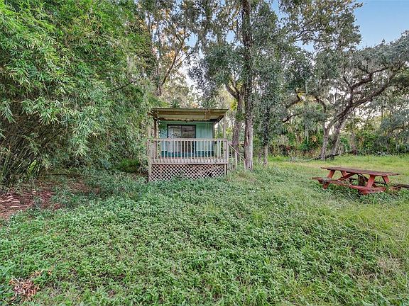 Covered wooden porchOpen floor planPicnic tableFl roomHardwood floorsPrivacy of tall bambooLarger closets