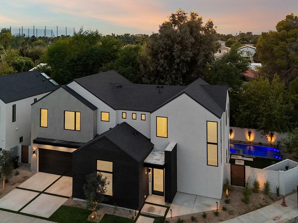 Designed for effortless indoor-outdoor living, the home features a covered front patio and a covered back patio with sparkling pool and firepit, creating the perfect space to relax or entertain. Smart home automation enhances every aspect of daily life, with preset modes like "Welcome," "Party," "Cocktail," and "Goodbye" that allow homeowners to control lighting, music, shades, and temperature with ease.