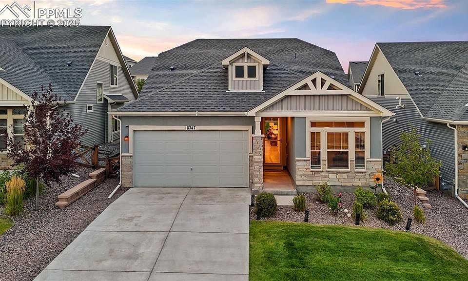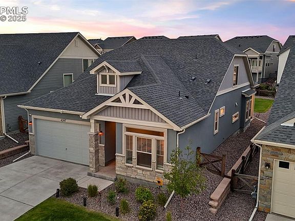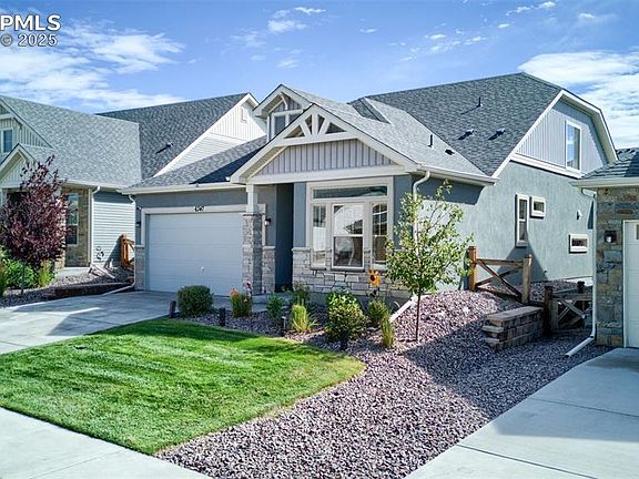 Welcome to this breathtaking 3-bed 3-bath home in coveted Banning Lewis Ranch! This stunning home features beautiful upgrades, including a statement tiled fireplace and Colorado room sliding glass door with custom shade blinds, quartz counters, tall ceilings and doors, beautiful light fixtures, and pretty kitchen backsplash. The inviting open floorplan between the kitchen, dining, and living rooms allows you to share quality time with loved ones. Enjoy crafting meals with the large island, gas stove top, stainless-steel appliances, and spacious pantry. Step out to the covered back patio and enjoy space to grill, garden, or relax in the impeccably landscaped backyard. The ceiling fan and extra shade helps keep you cool as you enjoy the outdoors. The spacious main-level primary suite features an ensuite bathroom with double vanity, spacious zero-entry shower, and walk-in closet that make getting ready a breeze. The main level boasts an additional bedroom, full bathroom, laundry room, and generous storage space. Head upstairs to the loft, which provides endless options for a family room, gym, office, and more. The upper level features an additional full bathroom and bedroom with a spacious walk-in closet, perfect for your guests to have some privacy. Enjoy all of the amenities this 55+ gated community has to offer, from the community center, trails, pool, pickleball courts, bocce ball, and more. Don’t miss your chance to make Banning Lewis Ranch your home- schedule your showing to see this spectacular home today!