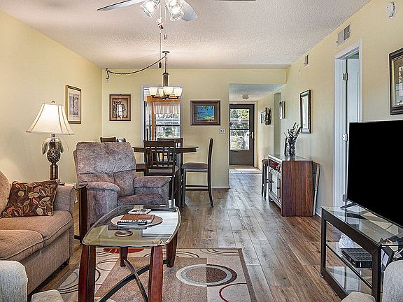 This is a First Floor NO STEPS Very Clean and Well-kept Ranch-style condo 1073 sq. ft. unit with 2 bedrooms,2 full baths, and a Laundry room. You have a covered carport for your vehicle and a short walk from your condo to your car. Enjoy dinners looking out over the lovely pond from your lanai. The grounds are very well-kept beautiful surroundings. Enjoy a swim in the pool and work out in the rec room area with lots of activities to enjoy. Nice area for walks around the pool. The Lania has rain guards 2021. Beautiful Stainless All New LG Appliances 2023. New A/C System 2022 with an air purifier. New Living room fan 2023. New Vinyl Bedroom Floors 2022. Water Heater 2021. Non-Smoking Condo. PLEASE NO CALLS TO LIST THE CONDO.