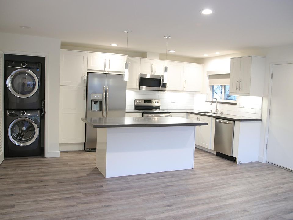Top Floor 6 year old Remodel Still Relevant. This Modern Building Is Located On a Dead End Street Walk-able to Vons. Open Concept Kitchen. Fully Equipped With Stainless, Quartz, and Full Size Washer/Dryer. Kitchen Island with seating for 4. Dimming LED Lighting Throughout. AC/ Heat is 3 Splits One in main area and 1 in each bedroom. New Windows With Custom Blinds. New Beautiful Gray Hardwood Style Flooring Throughout. 2 New Modern Baths; Tile, Glass Shower Doors, Vanity with Quartz. 2 Large Bedrooms. Two Off Street Parking Spaces, Tandem with Self Locking Storage. Large Self Locking Storage Closet Under Building Also For Bikes, Surfboards, Long Term Etc. Secure Gated Complex with call box Common Space Has New Lounges, Table and Complimentary Grill. Non Smoking Property of Any Kind. Inside, Neutered/Spayed, Cat Friendly, Limit 2 No Pet Rent or Deposit. Quiet Well Trained Dogs On A Case By Case Basis, $250 Refundable Deposit. No Pet Rent. Sorry No Pit Bulls or Pit Bull Mixes Due to Insurance Reasons. Dogs must be dog and people friendly. 1 year lease only. Water, Trash and Recycling included. Tenant Pays Electricity Metered to the Unit and Cable/Internet.