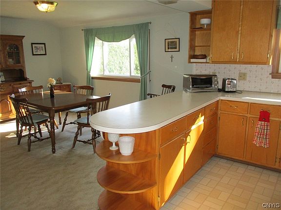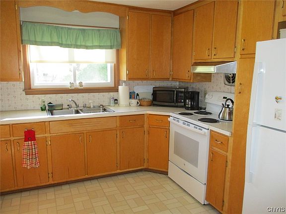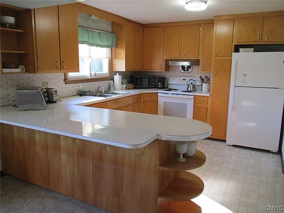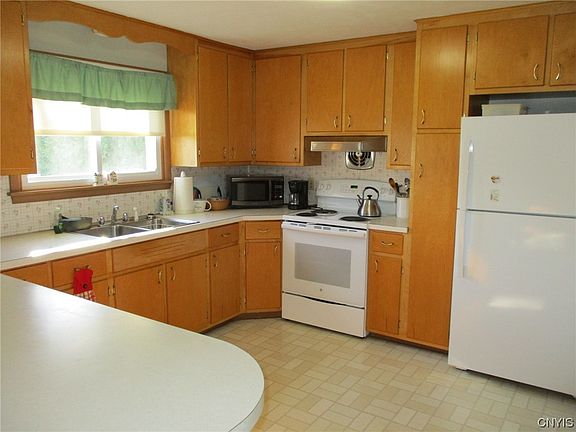 One level living in this one owner home that has been well maintained and is in excellent condition.. Bright open kitchen area that you can make your own with lots of counter space and cabinets. All appliances stay. Spacious eating area that will fit a oversized table. living room with picture window and a artificial brick fireplace. Three bedrooms all good size. Create extra living space in the full walk out basement. Nice large back yard that gives you privacy on both sides. Roof is 1 year old. Driveway was torn out and new one put in 2019. Garage doors put in 2018. Located in the West Genesee School Distrack