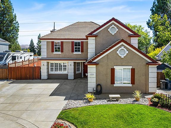 Stunning two-story Pulte Estate Home in Livermore! 5 bedrooms, 2.5 bathrooms, and 2,483 sq ft of beautifully designed living space. Step inside to soaring ceilings, custom shutters, and timeless details including wainscoting and crown molding. The home features two spacious living areas—one with an open-concept layout that flows seamlessly into the kitchen, complete with a cozy fireplace, ornate mantel, custom wall paneling, and oversized ceiling fan. The chef’s kitchen boasts a large island, stainless steel appliances, solid wood cabinetry, and stone countertops. Retreat to the luxurious main suite with vaulted ceilings, abundant natural light, deep soaking tub, shower stall, double vanity, and private water closet. Perfect for entertaining, the backyard is an oasis with a covered patio and fan, sparkling in-ground pool with fountains, mature shade tree, side yard access, and an oversized storage shed! A rare find that combines elegance, comfort, and outdoor living at its best! Owned Solar!! Huge side yard access gate and driveway!!!