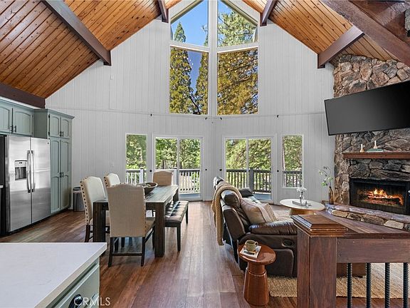 Welcome to your dream getaway in beautiful Lake Arrowhead. Situated on nearly 1/3 acre of lush, private land, this beautifully renovated prow-style home offers the perfect blend of modern comfort and classic mountain character—plus lake rights! Tucked into a serene setting with lush landscaping and a seasonal stream, the home features a spacious wrap-around deck ideal for entertaining or soaking in the peaceful surroundings. Inside, the open-concept living and kitchen area is filled with natural light, highlighted by soaring beam ceilings and a stunning stone fireplace that creates a warm and inviting atmosphere. The expansive primary suite is set on its own private upper level for added comfort. On the lower level, a custom-designed bonus space complete with a built-in wet bar, cozy nook seating, pool table and a second stone fireplace that adds a rustic touch to the entertainment area. A generous laundry room is already plumbed and sized for a potential third bathroom, and there’s abundant storage throughout the home. With a massive concrete driveway offering parking for 6 to 8 vehicles—plenty of room for guests, or even a boat—and easy year-round access to main roads, this home is as practical as it is picturesque. Whether you're looking for a full-time residence, vacation escape, or investment opportunity, this Lake Arrowhead property delivers comfort, charm, and room to relax.