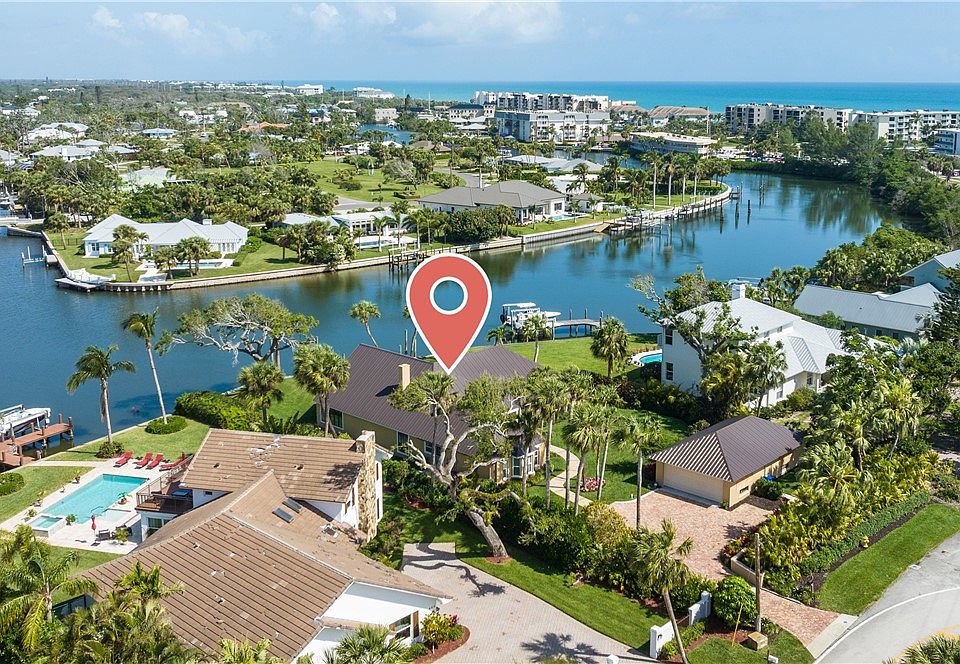 Panoramic wide water and sunset views overlooking Bethel Creek in Vero's sought-after central beach! Deep water boater's delight - seawall, private dock, direct Intracoastal access. +/- .44 acre lot 2 blocks from beach. Sparkling pool. Bright eat-in kitchen features walk-in pantry and lots of work space. Split plan 3 bedrooms with private guest wing plus laundry, storage and office. Generous room sizes. Newer metal roof. Detached garage houses an air conditioned game room or could be a 4 car garage. Attractive brick driveway, lush landscaping, lighting and more. Dimensions are approximate.